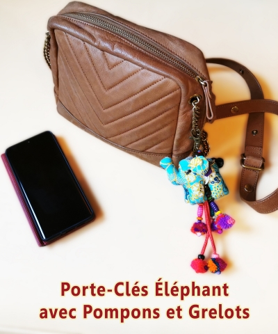 Porte-cles elephant avec pompons et grelots